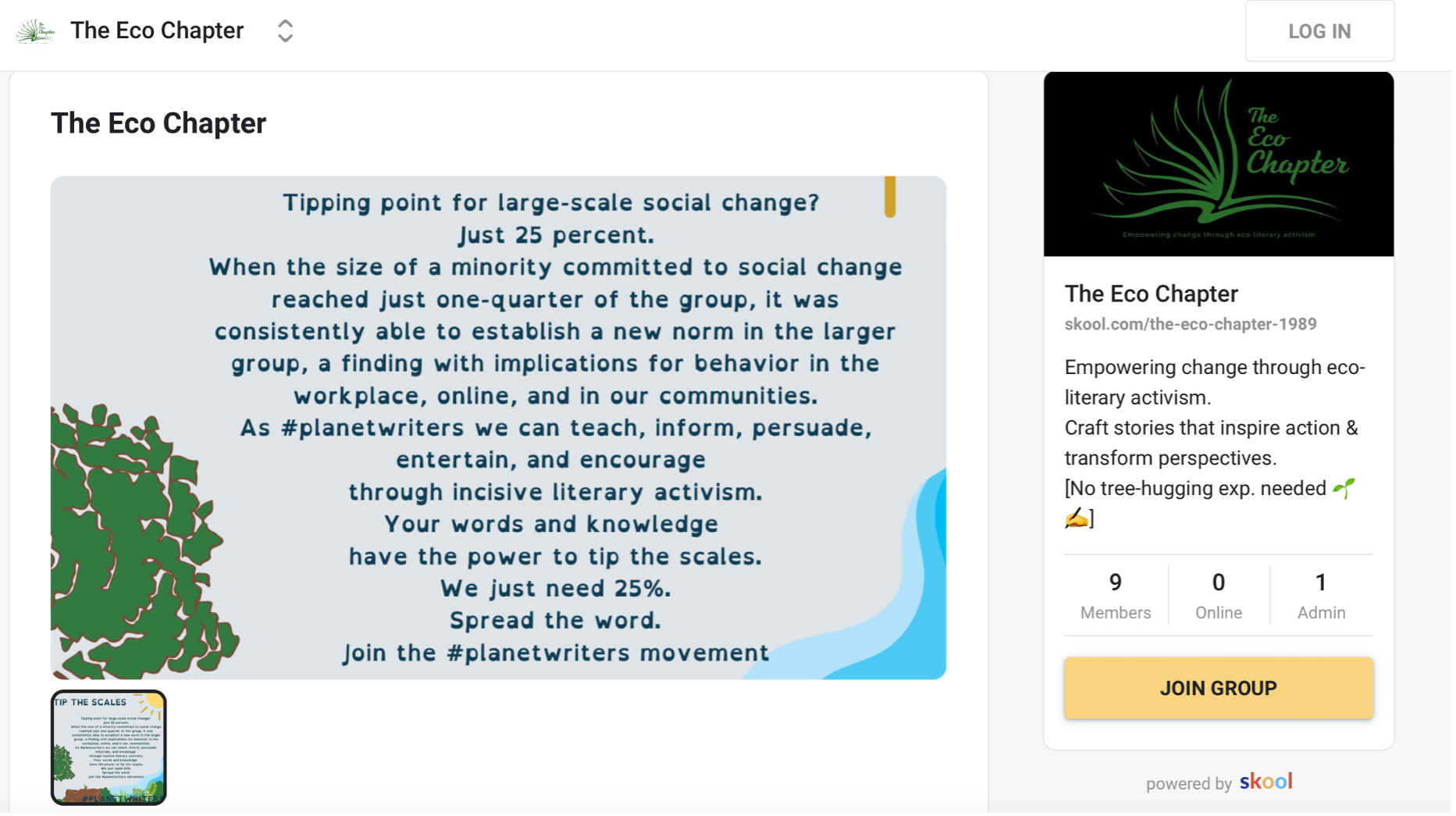 On The Eco Chapter @ Skool, you will find courses on how to improve your English language, writing tips, Eco Books, Eco information, daily writing prompts, and creative writing courses.